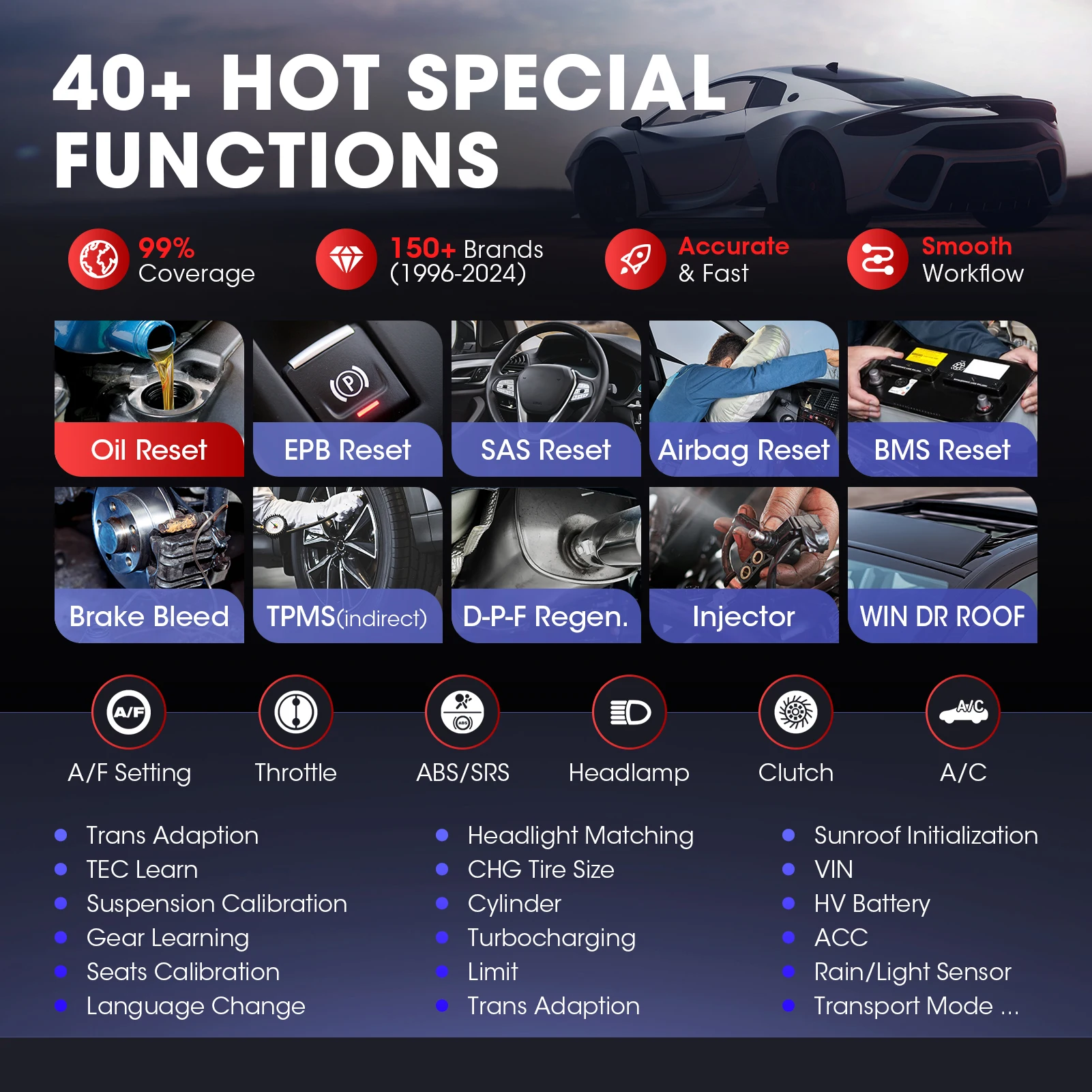 - 40+ fonctions de service : opérations d’entretien et de remise à zéro (disponibilité variable selon marque/modèle).